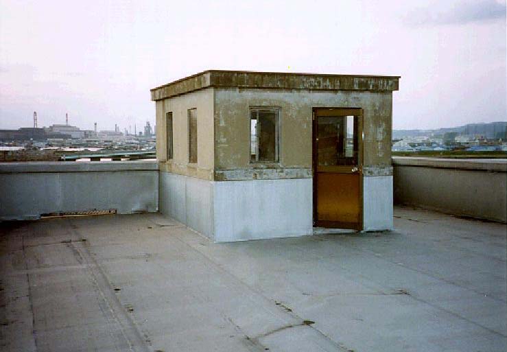 小さなペントハウスには木製の梯子で昇ります。いつから使用されているかは不明ですが、屋階コンクリートスラブの端部に梯子のささら桁に切り込んだ顎をかけるだけの簡単なものです。屋上に出るのは命がけですが、ここから紀ノ川の広々とした眺めを臨むことができます。